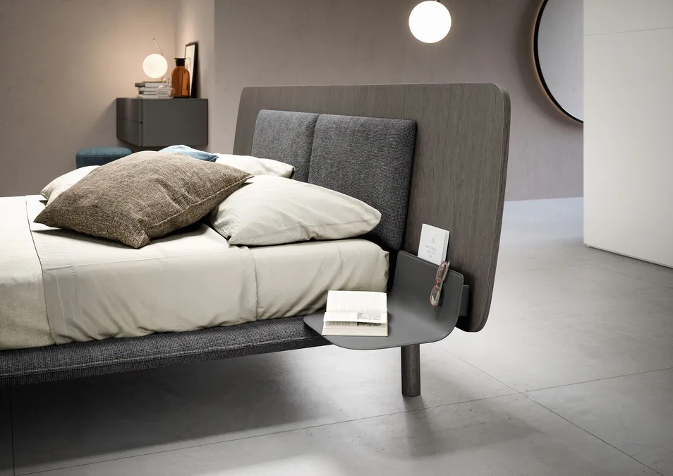 Das Bett MATISSE besitzt einen hohen Wiedererkennungswert und ist ein echter Blickfang. Das Kopfteil ist auch als gepolsterte Version erhältlich und ragt auf einer oder auf beiden Seiten über das Bett hinaus. Dieser Überstand lässt sich nutzen, um elegante Ablageflächen aus Leder zu integrieren.