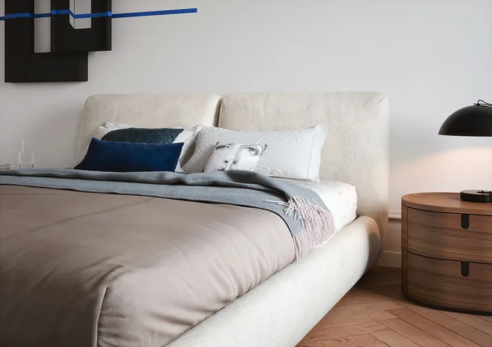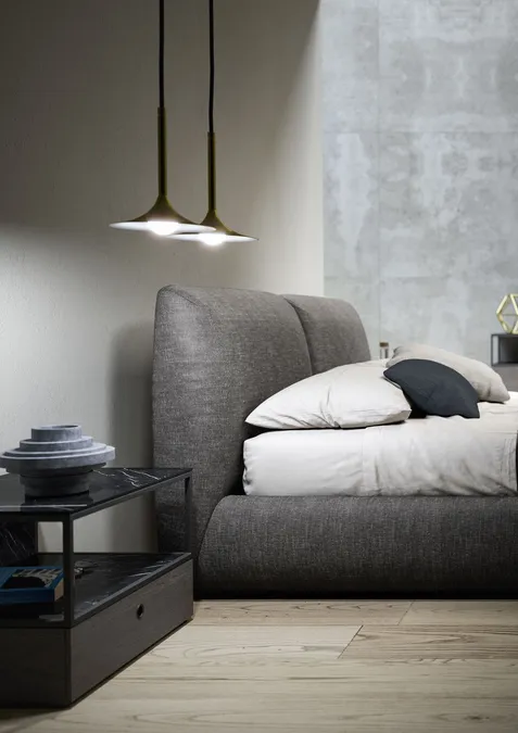 Das Bett MIDNIGHT zeichnet sich durch ein elegantes Design aus, das weiche und moderne Linien gekonnt kombiniert. Das Kopfteil, das aus zwei nebeneinander angeordneten, abgerundeten Kissen besteht, fügt sich perfekt in die ebenso gerundete, gepolsterte Bettumrandung ein und bietet ein Gefühl von Kontinuität und fließenden Linien. Das Bett MIDNIGHT ist auch in einer Version mit Staukasten und manuellem oder motorisiertem Hubmechanismus erhältlich, durch den der Federholzrahmen in eine erhöhte und damit bequemere Position gebracht werden kann.