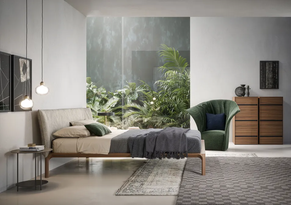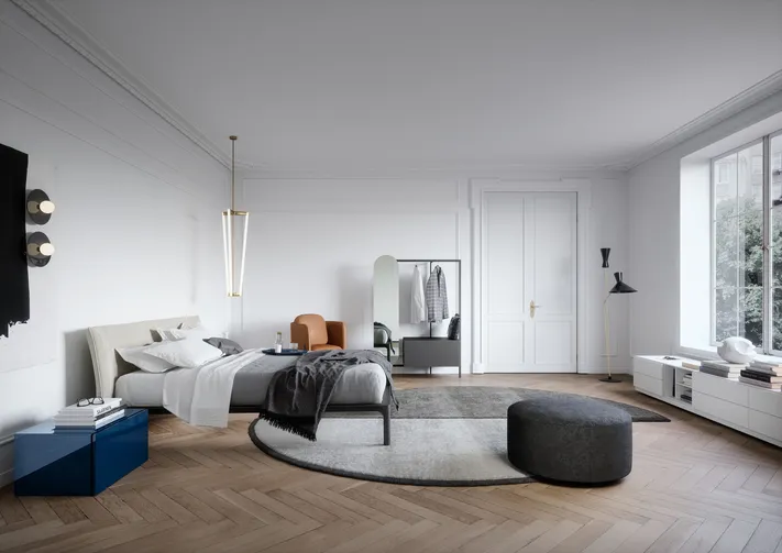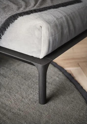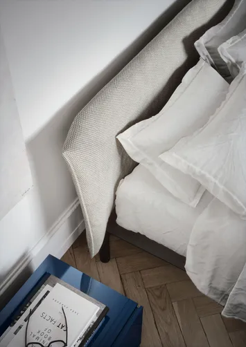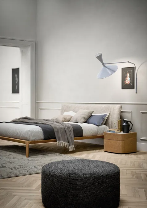 Sorgfalt bei den Details, Leichtigkeit und Charakterstärke. PARK ist ein Bett mit einem Kopfteil in Stoff, Leder und mit einer Bettumrandung aus Holz.