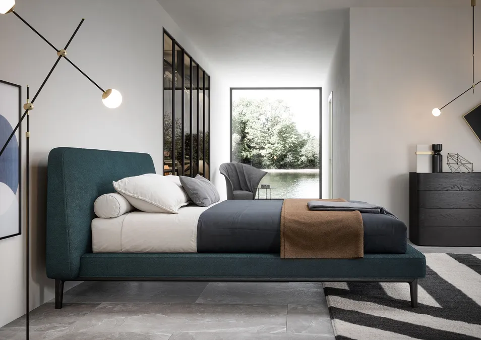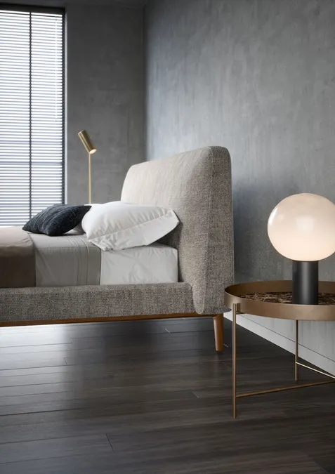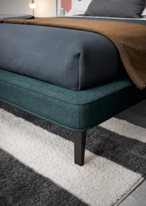 Das moderne, zeitgemäße Design, das von einem großen, gepolsterten Kopfteil geprägt wird, bestimmt den Stil des Bettes SEEYOU. Das Kissen mit seiner weichen, sich nach oben verjüngenden Form ist das charakteristische Element dieses Bettes. Die umlaufende, etwas breitere Bettumrandung mit schmalen Holzfüßen verleiht dem Bett Leichtigkeit und schlichte Eleganz.