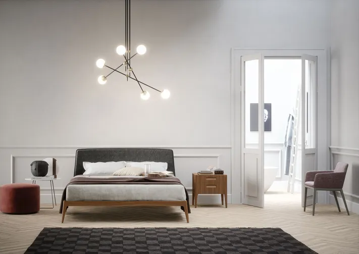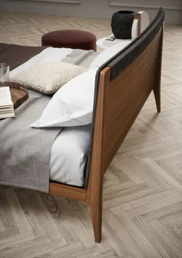 Das Bett SIRI besticht mit seinen gerundeten Linien durch sein einfaches und zeitloses Design. Es ist in den Eichenfurnierausführungen Rovere miele, Rovere terra und Rovere carbone sowie in der Nussbaumausführung Noce Canaletto erhältlich. Auf Wunsch auch mit Kopfteilbezug aus abnehmbaren Stoff oder aus Leder.