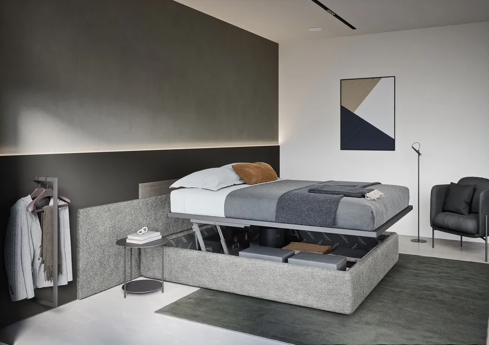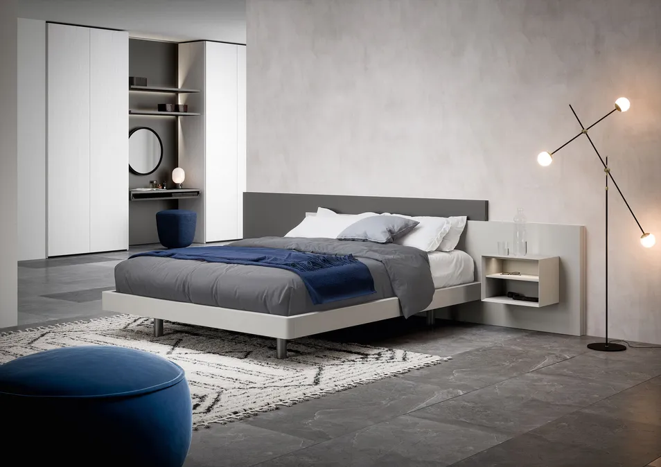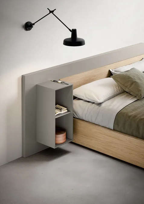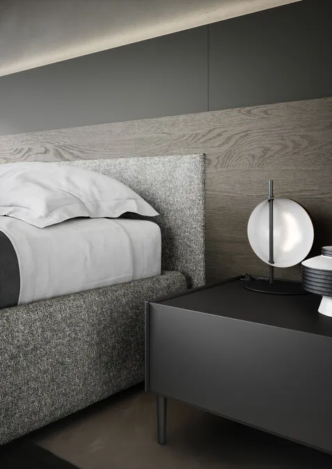 Das wandmontierte Design-Kopfteil TIME besteht aus zwei sich überlappenden Paneelen mit unterschiedlicher Höhe. Hierbei können verschiedene Ausführungen miteinander kombiniert werden, darunter auch abnehmbare Bezüge aus Stoff oder Textilleder.