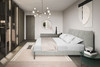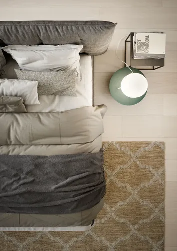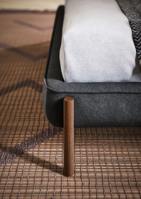 Die Weichheit des gepolsterten Kopfteils wird durch die horizontalen Nähte TUFTÉ nicht nur Hochwertigkeit verleihen, sondern auch zu seinem charakteristischen Erscheinungsbild beitragen. Die Bettumrandung, minimal und funktional, ruht auf Holzbeinen, welche den Eindruck vermitteln, das Bett würde im Raum schweben.