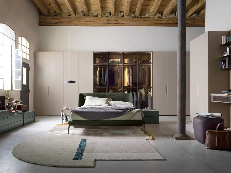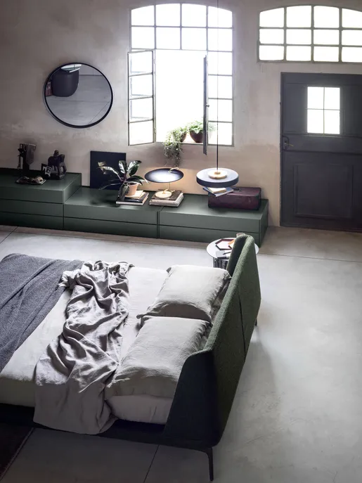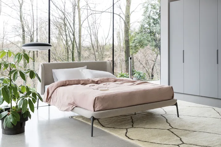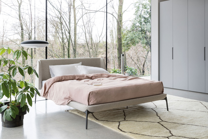 Das Bett vervollständigt die Polsterkollektion VELVET für den Wohnbereich – Sofa, Sessel und Pouf – von denen es die sanft geschwungene Linienführung übernommen hat. Leicht und bequem, aber gleichzeitig elegant, zeichnet es sich durch ein weiches Kopfteil aus, das sich wie bei einer willkommen heißenden Umarmung öffnet.