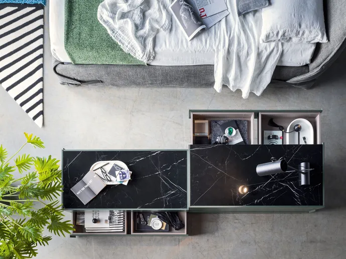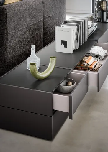 GIRO-GIRO ist ein Schubladensystem mit modularen, zusammenstellbaren Schubladen auf allen Seiten der Stauelemente. Es bietet maximale Planungsfreiheit, da sich Korpus und Fronten der Schubladen in den verschiedensten Ausführungen und Farbtönen gestalten lassen. So lassen sich originelle grafische Effekte durch unterbrochene Linien kreieren, die den vertikalen Linien folgen oder sich mit ihnen schneiden. Wirkungsvoll ergänzt wird dieses grafische Spiel noch durch den kleinen Metallgriff.