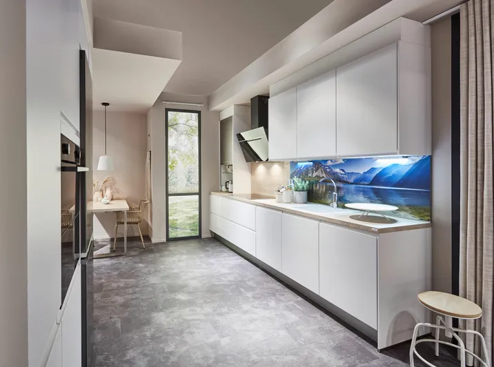 Wohnen im Industriedesign hat einen ganz eigenen Charme und das gewisse Etwas. Das Design aus rauem Klinker, der Mischung aus matten Lackfronten mit Tischplatte in Alpinweiß und dem Echtholzboden passen gut zum urbanen Lebensgefühl. Dabei muss man nicht in eine Lagerhalle ziehen, um den Industrial Chic erleben zu können. Mit unseren Nischenverkleidungen mit Digitaldruckmotiven kann man auch kleinen Räumen einen industriellen Touch verleihen.