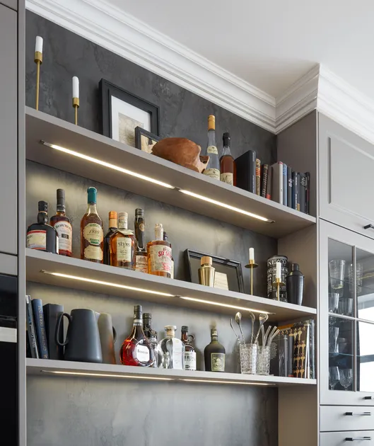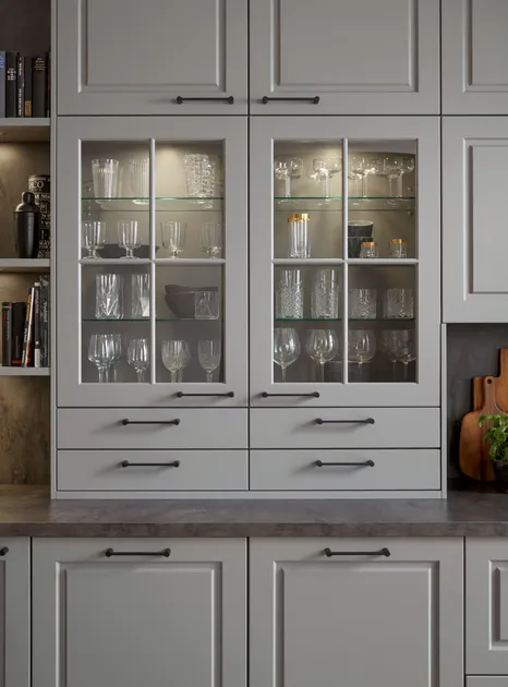 Schick, elegant und zurückhaltend. Die Kombination aus achatgrauen Fronten mit einer Arbeitsplatte in Oxid graphit und einer dunklen, beleuteten Nischenverkleidung erzeugt ein stimmiges und stimmungsvolles Gesamtbild.