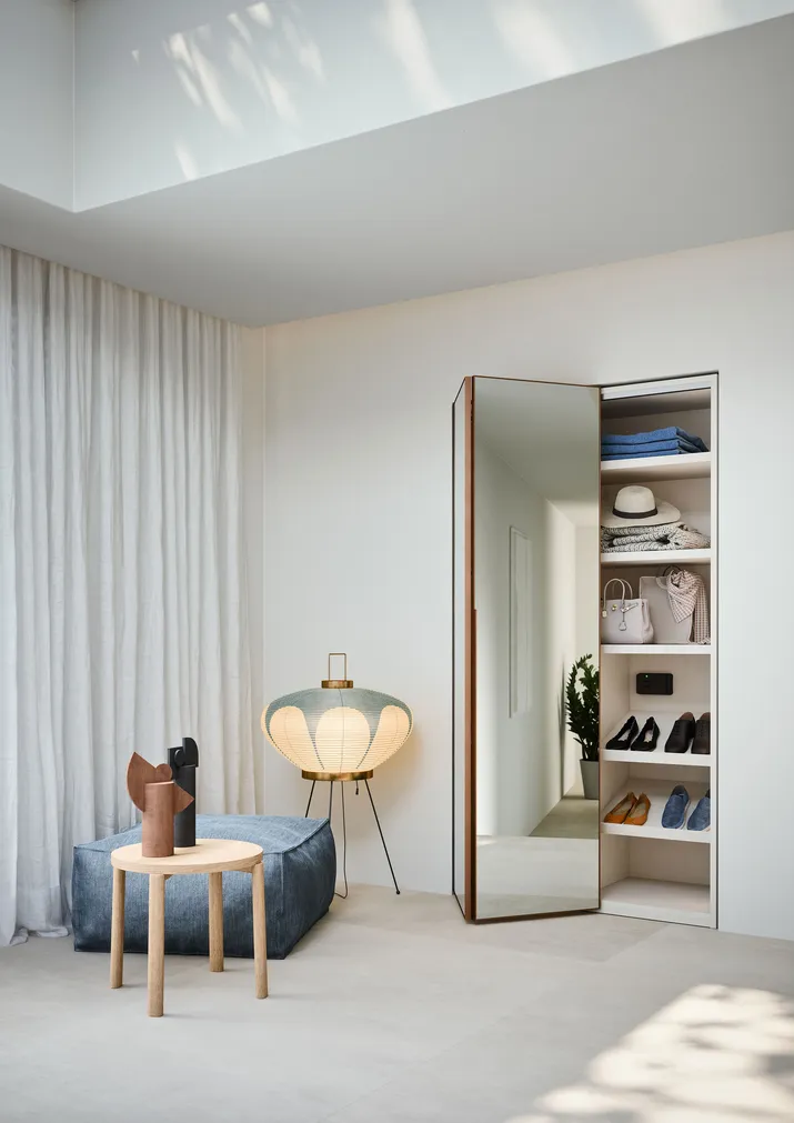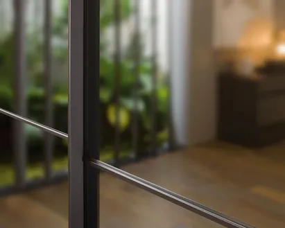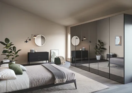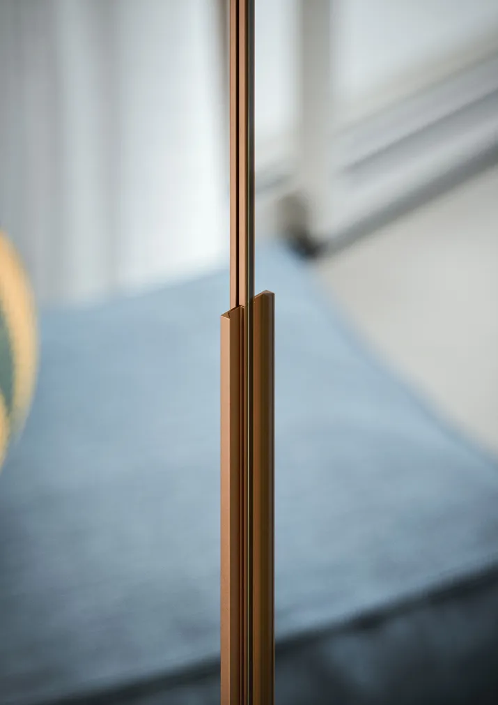 Saubere Linienführung beim Schrank mit Flügeltüren CRYSTAL. Er ist mit Spiegel und profil in gebürstetem Edelstahl oder brüniert sowie in allen matten, oxidierten oder metal Lackfarben. Der Schrank CRYSTAL kann als Einbauschrank sowie als Wand- oder Ecklösung geplant werden. Wie alle Schränke mit Flügeltüren kann auch er mit Glasseitenwänden und innen mit einer Trennwand mit Metallrahmen geplant werden. Auf Wunsch auch mit LED-Beleuchtung.