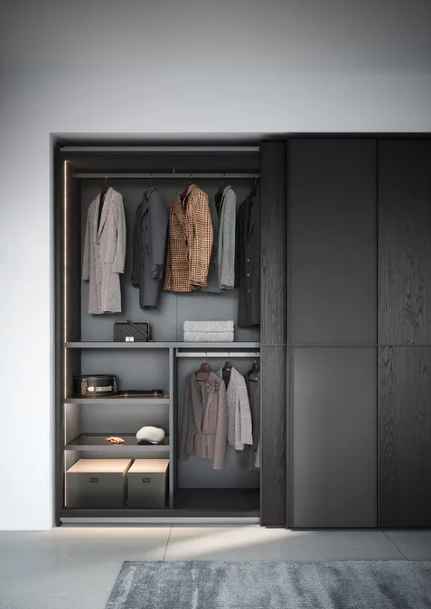 LAYER ist ein äußerst funktionaler Schiebetürenschrank mit frischem, modernem Erscheinungsbild. Durch die gerippten oder grau schattierten Glastüren entsteht ein effektvolles Spiel mit Transparenzen. Gleichzeitig sorgen diese aber auch dafür, dass sich der Inhalt aller Fächer zeitgleich überblicken lässt. Der Rahmenaufbau der Tür mit integriertem Griff bietet ein Höchstmaß an individueller Gestaltungsfreiheit, einschließlich der Möglichkeit, Glas mit anderen Materialien zu kombinieren.