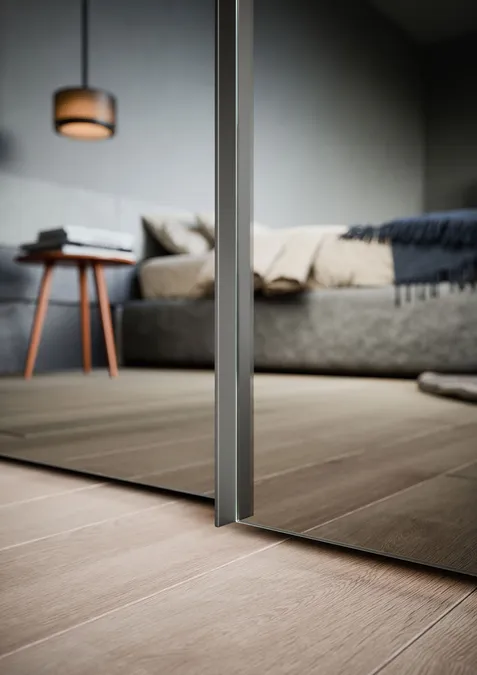 Moderne Linienführung beim Schrank mit Schiebetüren OFFSET. Das Paneel mit Einsatz wird in allen matten, oxidierten Lackfarben sowie in melaminbeschichtet-gemasert und Super-matt angeboten. Einsatz in Spiegelausführung und in lackiertem Glas.