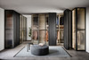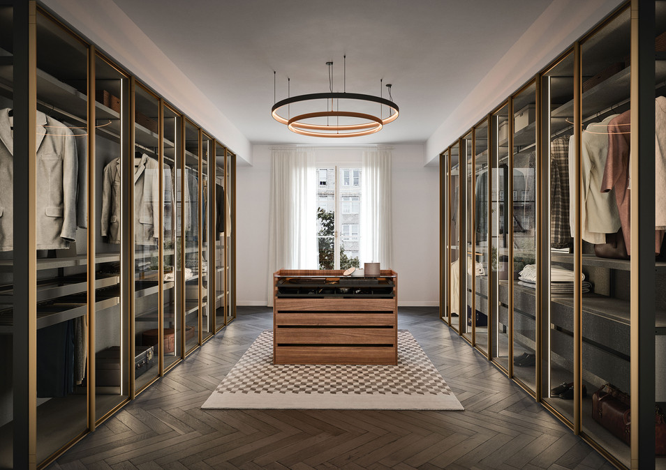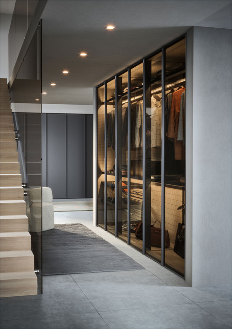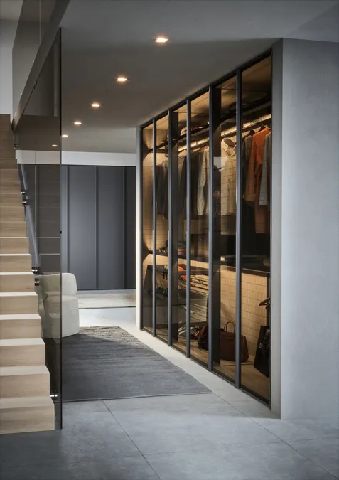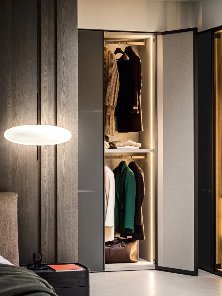 Zeigen und verstecken, aufbewahren und sichtbar machen: der Flügeltürenschrank PERRY lässt sich leicht an seiner Tür mit Metallrahmen aus gehärtetem Glas oder Paneel aus diversen Materialien, einschließlich Leder, erkennen, wobei die verschiedenen Materialien auch untereinander kombiniert werden können. Der Schrank kann als Einbau- oder Wandschrank mit dem Panorama-Öffnungssystem ausgestattet werden, das eine 180-Grad-Öffnung der Türen – auch die des Eckelements – vorsieht. Damit sind alle Innenfächer äußerst leicht und bequem zugänglich. Wie alle Schränke mit Flügeltüren kann auch er mit Glasseitenwänden und innen mit einer Trennwand mit Metallrahmen geplant werden. Auf Wunsch auch mit LED-Beleuchtung.