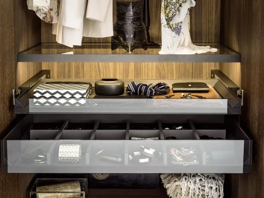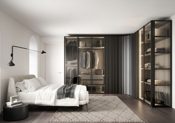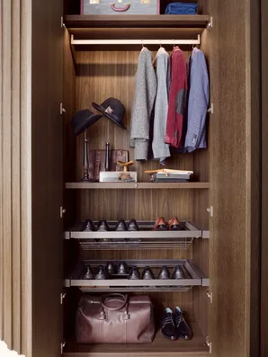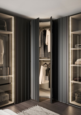 Die Türen mit senkrechten Streifen, die Grundelemente mit geschwungener Linienführung und die Tip-on-Öffnung sind nur einige der Elemente, welche die Einzigartigkeit des Schrankes mit Flügeltüren STAVE ausmachen. Der Tip-on-Beschlag macht die Tür funktional, hochwertig und aus ästhetischer Sicht makellos. So wirkt der grifflose Schrank wie eine Wandtäfelung. STAVE lässt sich aus diesem Grund hervorragend als Trennwand zwischen zwei Räumen einsetzen.
