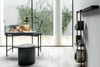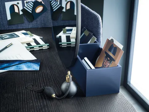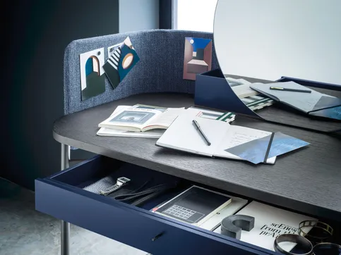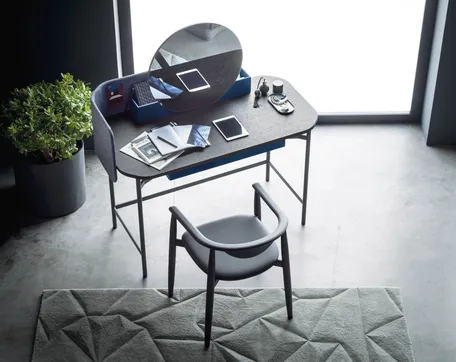 NINFEA ist ein Schreibtisch mit graziler Eleganz. Seine schlanken Metallbeine tragen eine Platte mit abgerundeter Form, die durch eine Schublade unter der Schreibtischplatte und eine Sichtblende mit abziehbarem Stoff- und Textillederbezug ergänzt wird. An der kleinen Sichtblende lassen sich Zettel oder sonstige Unterlagen mit Magneten befestigen. Der Schreibtisch eignet sich ideal, um im Schlafbereich eine kleine Arbeitsnische zu schaffen, lässt sich aber dank seines runden Spiegels und der Ablageschalen aus Holz auch als Frisiertisch nutzen.