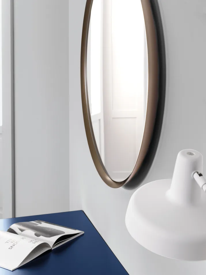 DEEP ist ein Spiegel mit kreisrunder Form, der in zwei Varianten, in einer kleinen und einer großen Version, angeboten wird. Der Rahmen, auch mit integrierter Beleuchtung, ist in allen matten, oxidierten und metal Lackfarben des Katalogs erhältlich. So lässt er sich perfekt auf die Einrichtung im Eingangs- oder auch Wohn- oder Schlafbereich abstimmen.