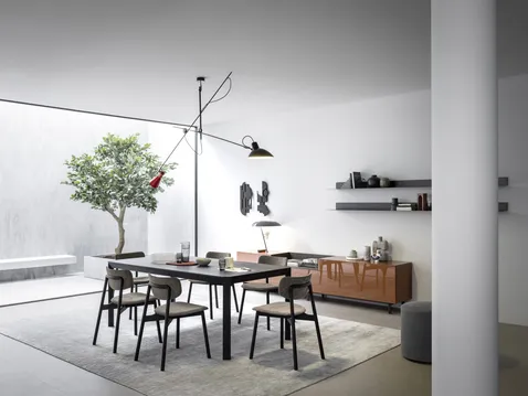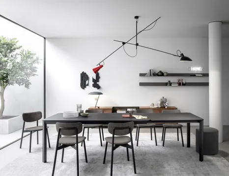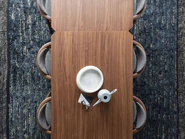 Ein ausziehbarer Tisch aus essentiellen Elementen, die untereinander auf originelle Weise kombiniert wurden: Der Rahmen, welcher die Tischplatte trägt, ist mit den Tischbeinen verbunden, deren besondere Anordnung an den jeweiligen Ecken zu dem außergewöhnlichen Erscheinungsbild dieses Tisches beiträgt. STRETCH wurde für das gesellige Beisammensein bei Ihnen zu Hause entwickelt: der Tisch lässt sich bis auf eine Länge von drei Metern ausziehen, an ihm finden damit bis zu 12 Personen Platz.